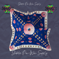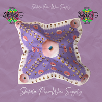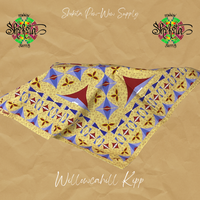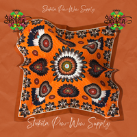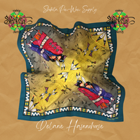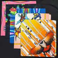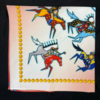 Shokota Powwow Supply merchandise. Cotton Bandanas measure 30x30". Satin Scarves have the same designs, measure 36x36" (1 yd). Bags measure 10x7.5" and are lined.